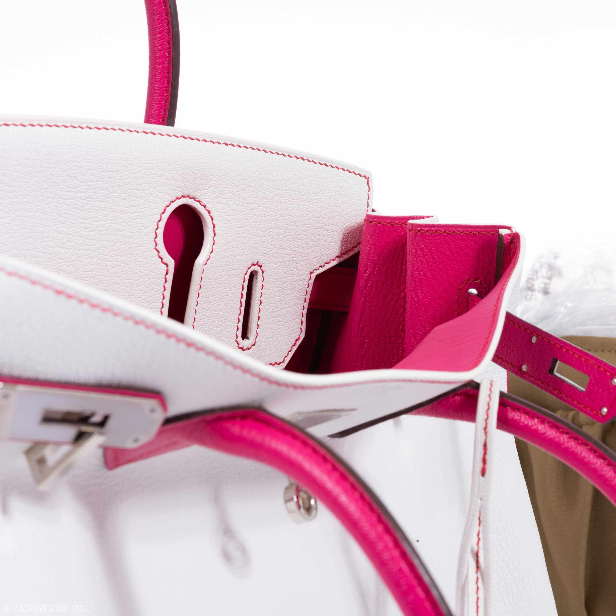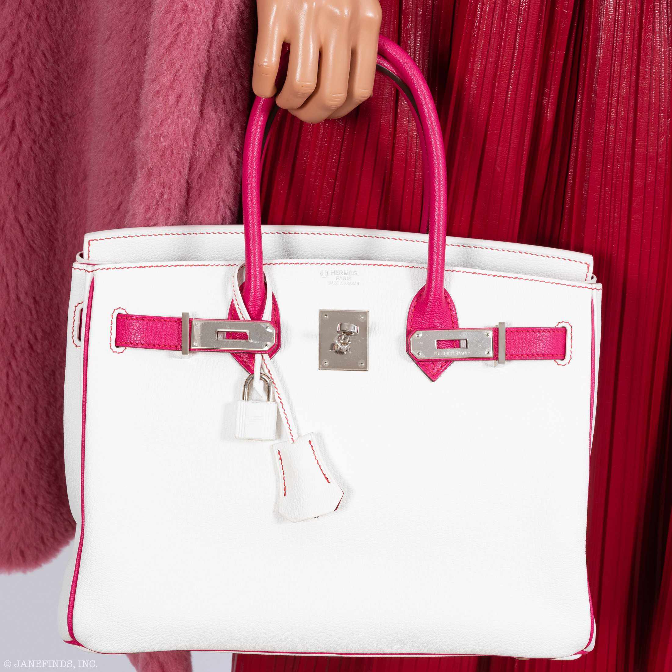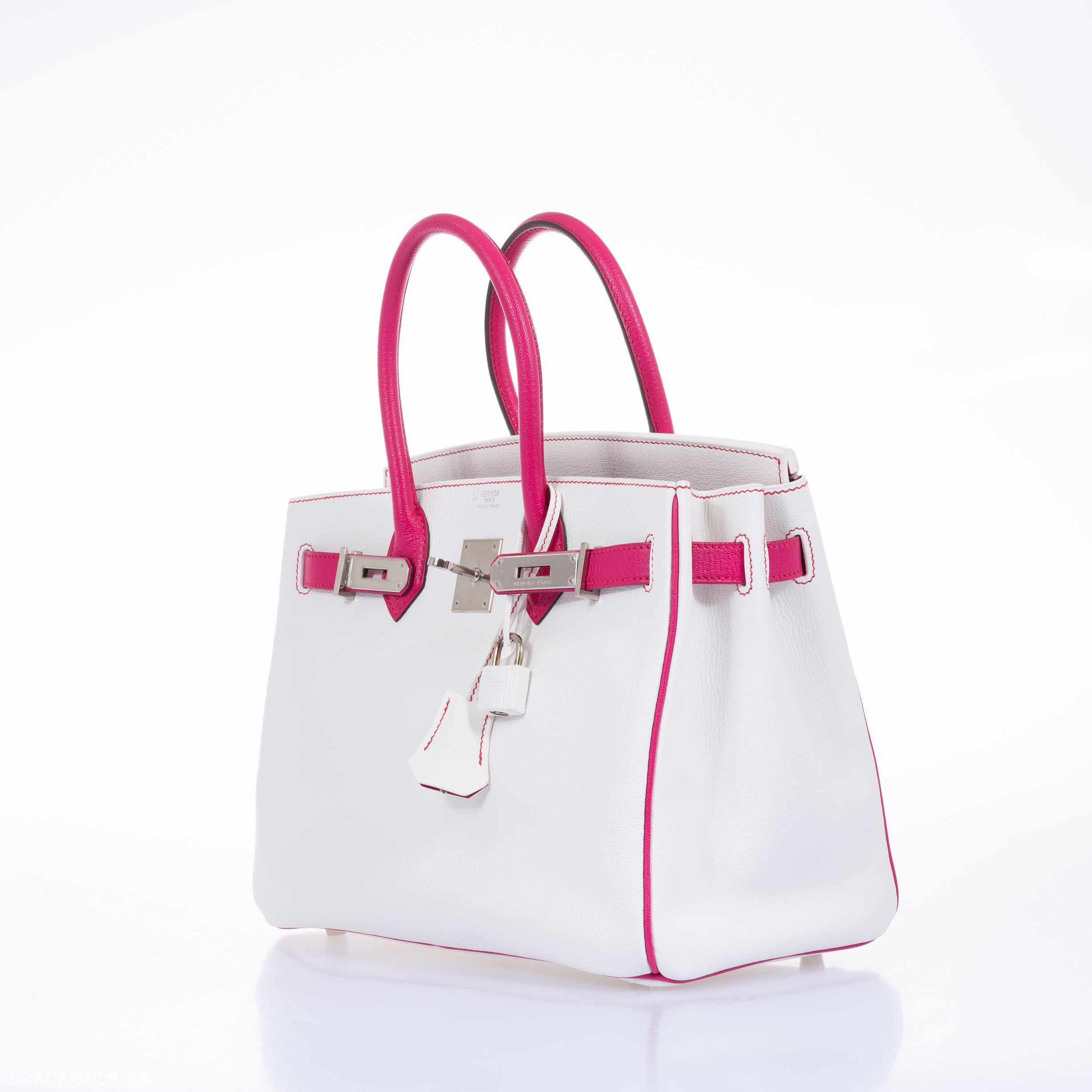Elegance meets sophistication with the Hermès Birkin 30 HSS in White & Fuchsia. Crafted from luxurious Chevre leather and adorned with Palladium hardware, this iconic handbag is a symbol of timeless style and impeccable craftsmanship. The striking contrast between the pristine white and vibrant fuchsia colors makes a bold fashion statement, perfect for those who dare to stand out.